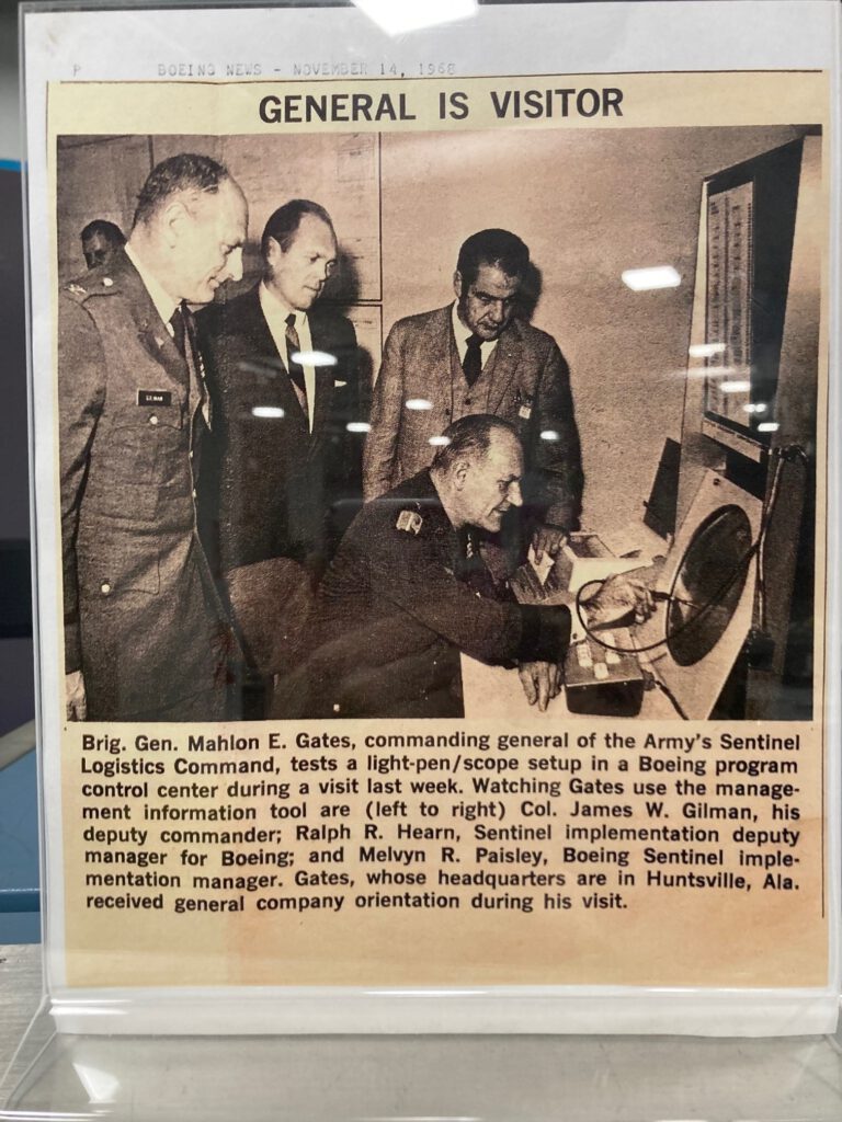 In November 1968, Boeing engineers demonstrated to Brigadier General Mahlon E. Gates, Commanding General of the Army’s Sentinel Logistics Command, a hybrid computing system built around a DEC PDP-7A and a Type 340 graphics display. The PDP-7A functioned as an interactive front-end processor, handling light-pen input and real-time display refresh, while an SDS-930 provided high-precision floating-point computation for missile defense simulations. The Type 340’s ability to render vectors and alphanumeric data under program control enabled Boeing to prototype battle management consoles where an operator could manipulate data directly on the screen. This configuration anticipated later command-and-control systems and represented an early example of distributed computing, coupling minicomputer interactivity with mainframe computational power. The demonstration, reported in Boeing News on November 14, 1968, underscored the PDP-7’s pivotal role in bridging interactive computing with aerospace and defense applications during the Cold War.